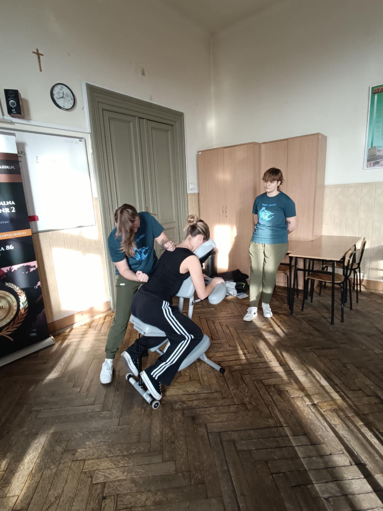 Kolejne spotkanie miało miejsce 16.12.2025 roku i było skierowane do uczniów klas czwartych w ramach doradztwa edukacyjno-zawodowego. Młodzież miała okazję poznać ofertę kształcenia Małopolskiej Policealnej Szkoły Masażu Leczniczego nr 2 z Oddziałami Integracyjnymi w Krakowie. Słuchacze szkoły zaprezentowali praktyczne umiejętności masażu, z których skorzystały uczennice klasy 4e. Spotkanie było doskonałą okazją do poznania szkoły „z sąsiedztwa” oraz specyfiki zawodu masażysty.