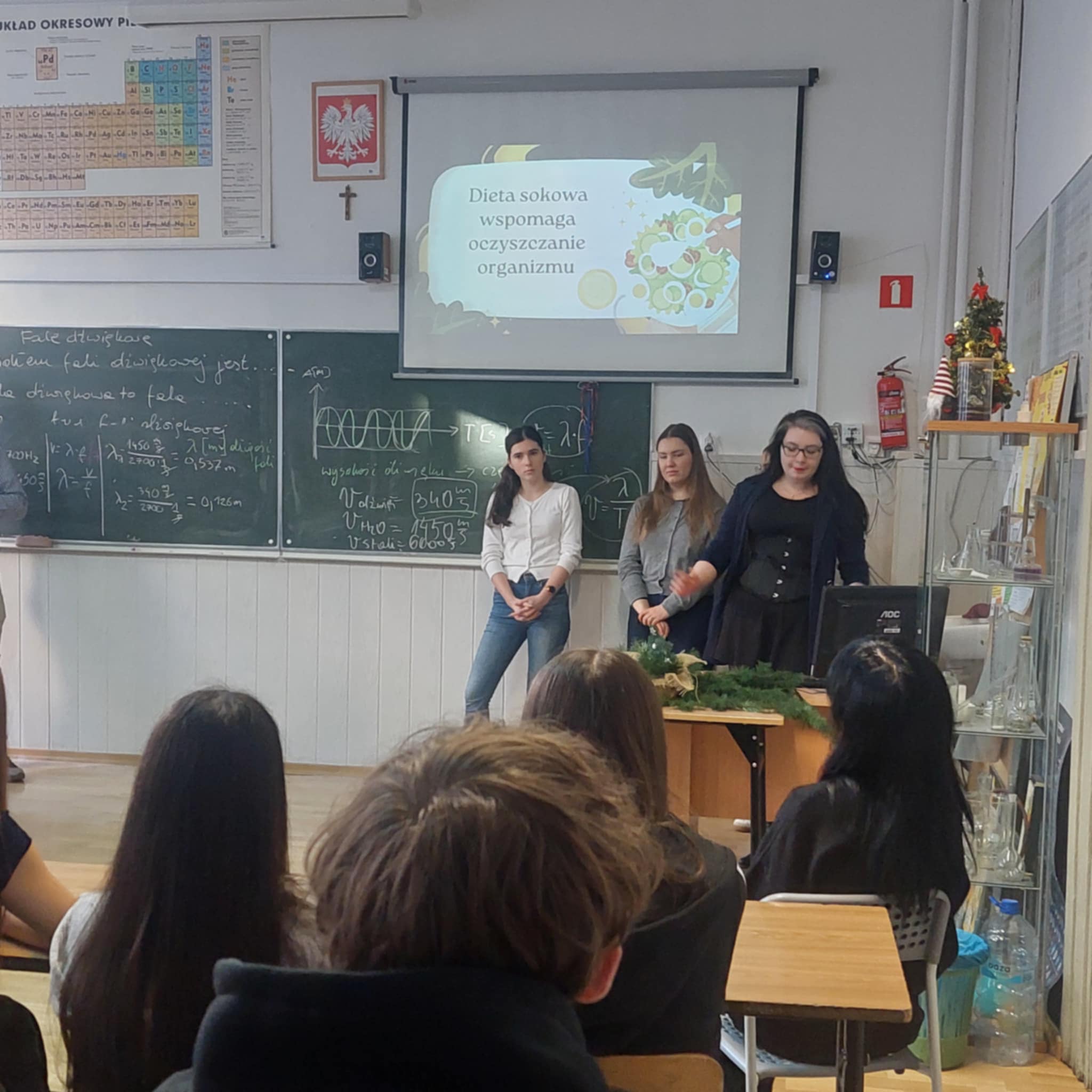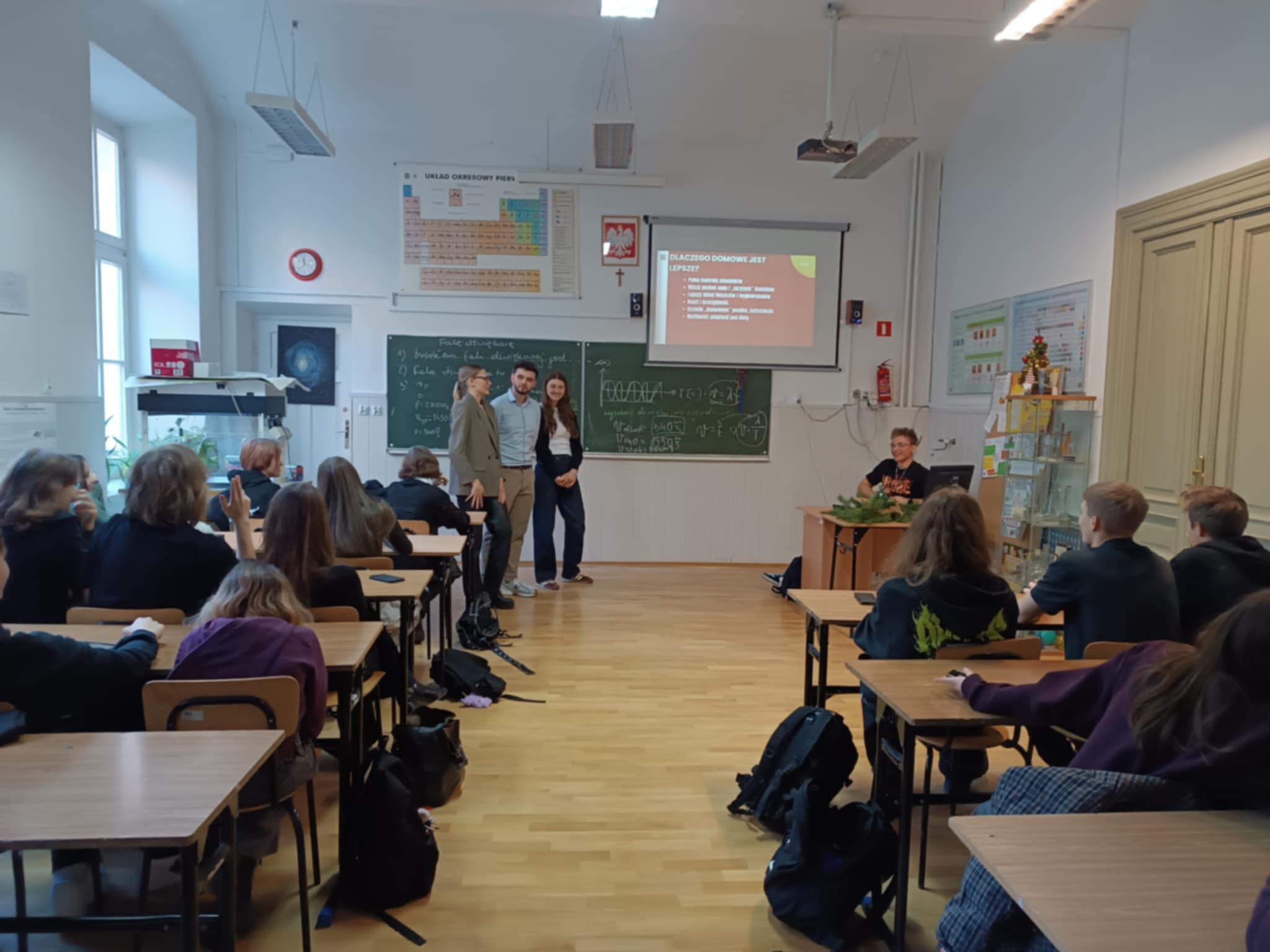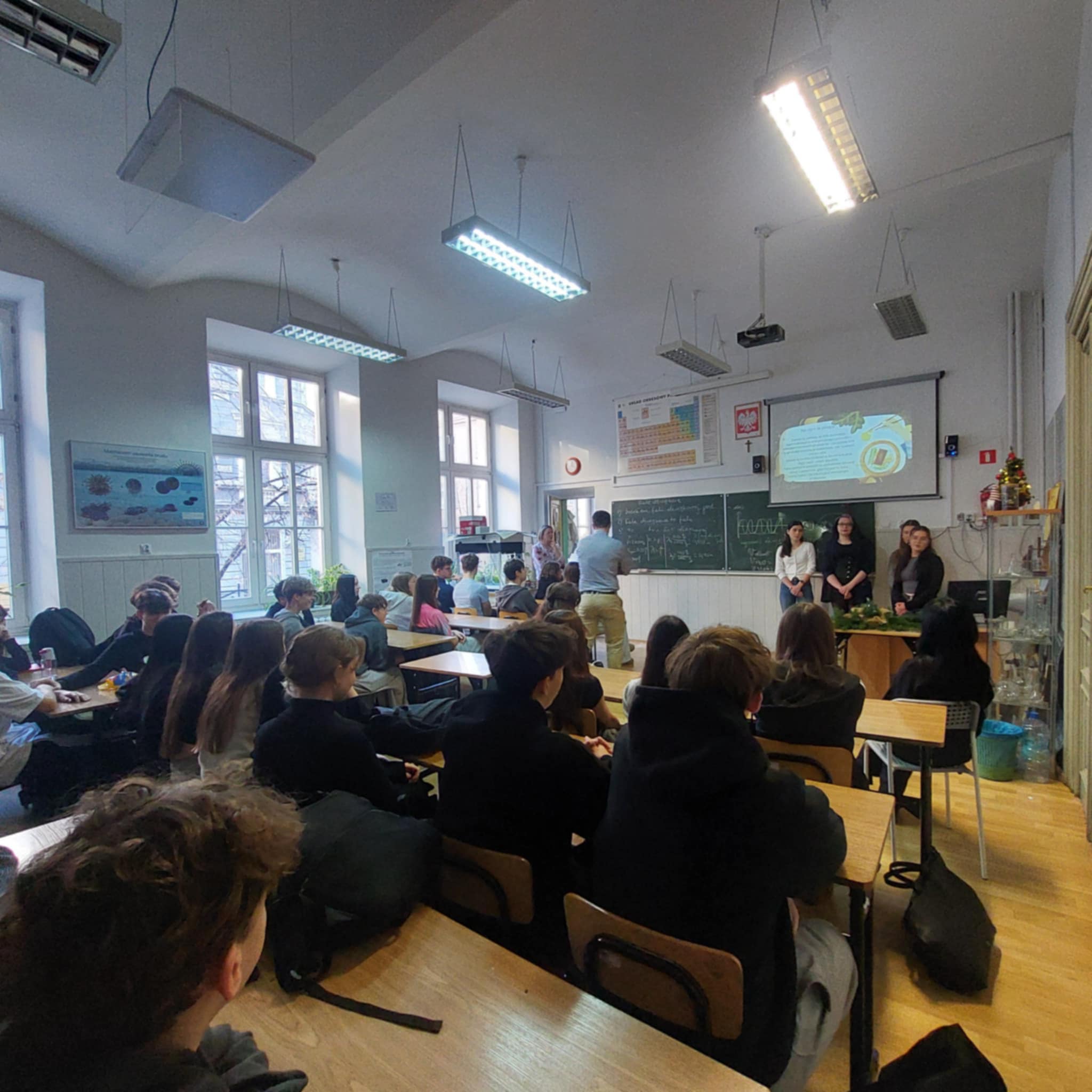 Pierwszym z wydarzeń była wizyta studentów Wydziału Dietetyki Uniwersytetu Jagiellońskiego, która odbyła się 10.12.2025 roku. Goście spotkali się z uczniami klas 1a, 1b, 1d, 1e oraz 3a, przybliżając im – w humorystyczny i pełen życzliwości sposób – wpływ diety na zdrowie człowieka. Zajęcia odbywały się pod intrygującymi tematami, takimi jak: Fast-foody pod lupą, Popularne diety – czyli jakie pułapki żywieniowe promują social media, Żywieniowe fakty i mity zaczerpnięte z TikToka oraz Źródła kofeiny – energetyki, napoje słodzone i kawa – ich wpływ na organizm człowieka. Studenci wyczerpująco odpowiadali na liczne pytania uczniów, rozwiewając wiele wątpliwości związanych z codziennymi wyborami żywieniowymi.