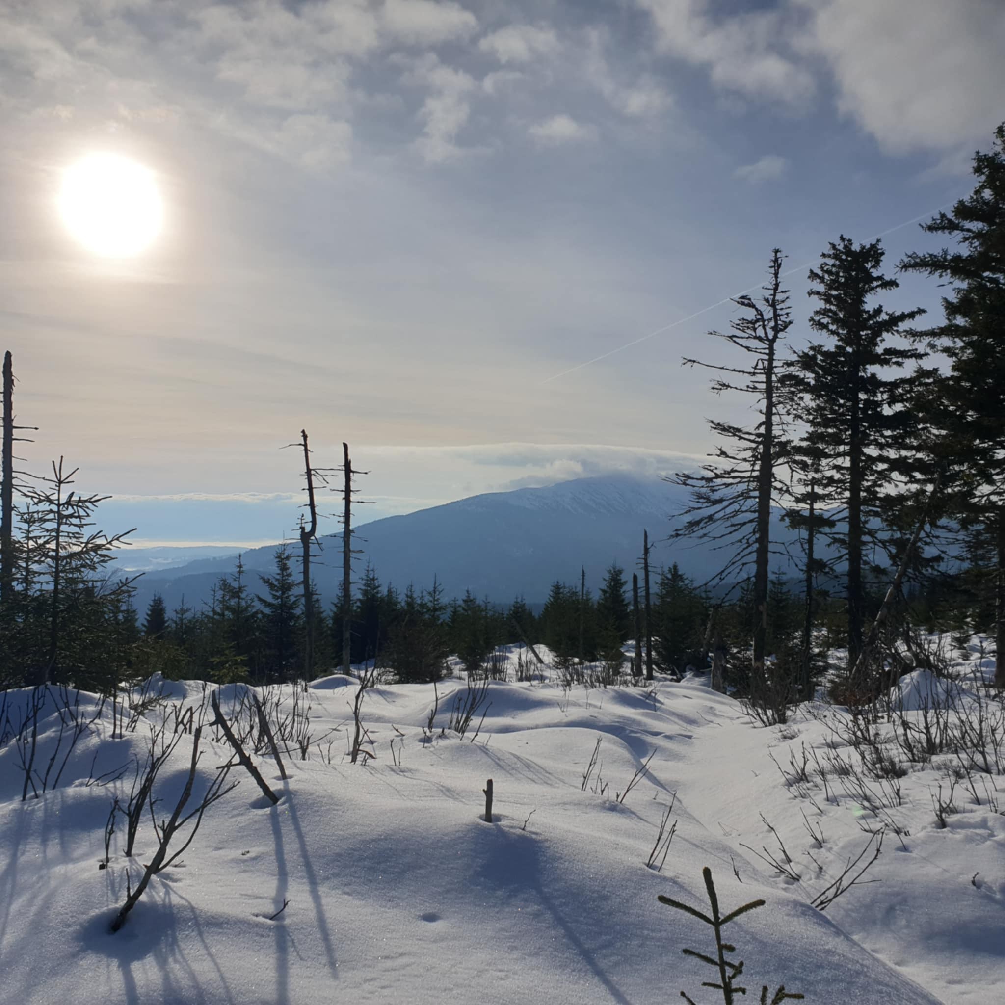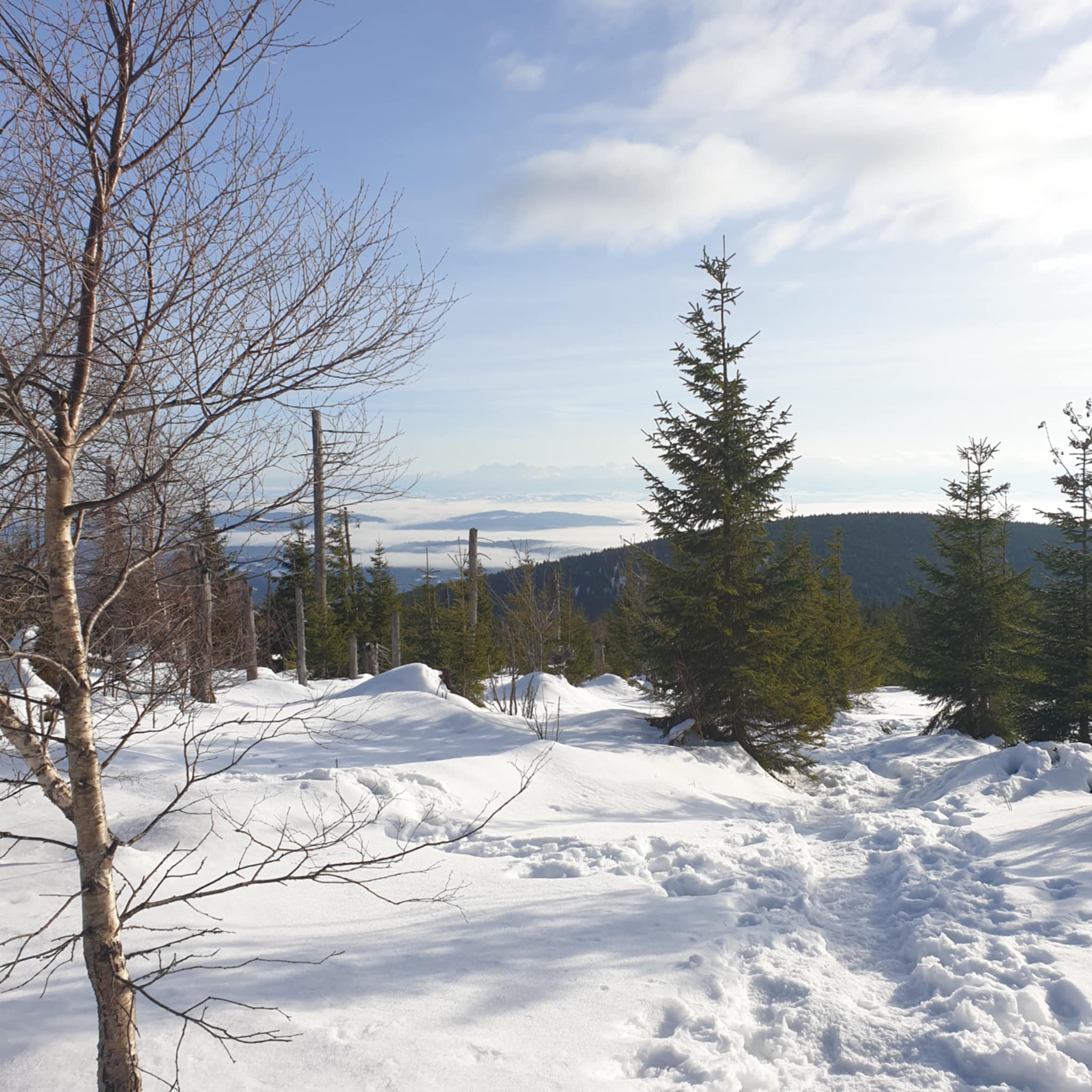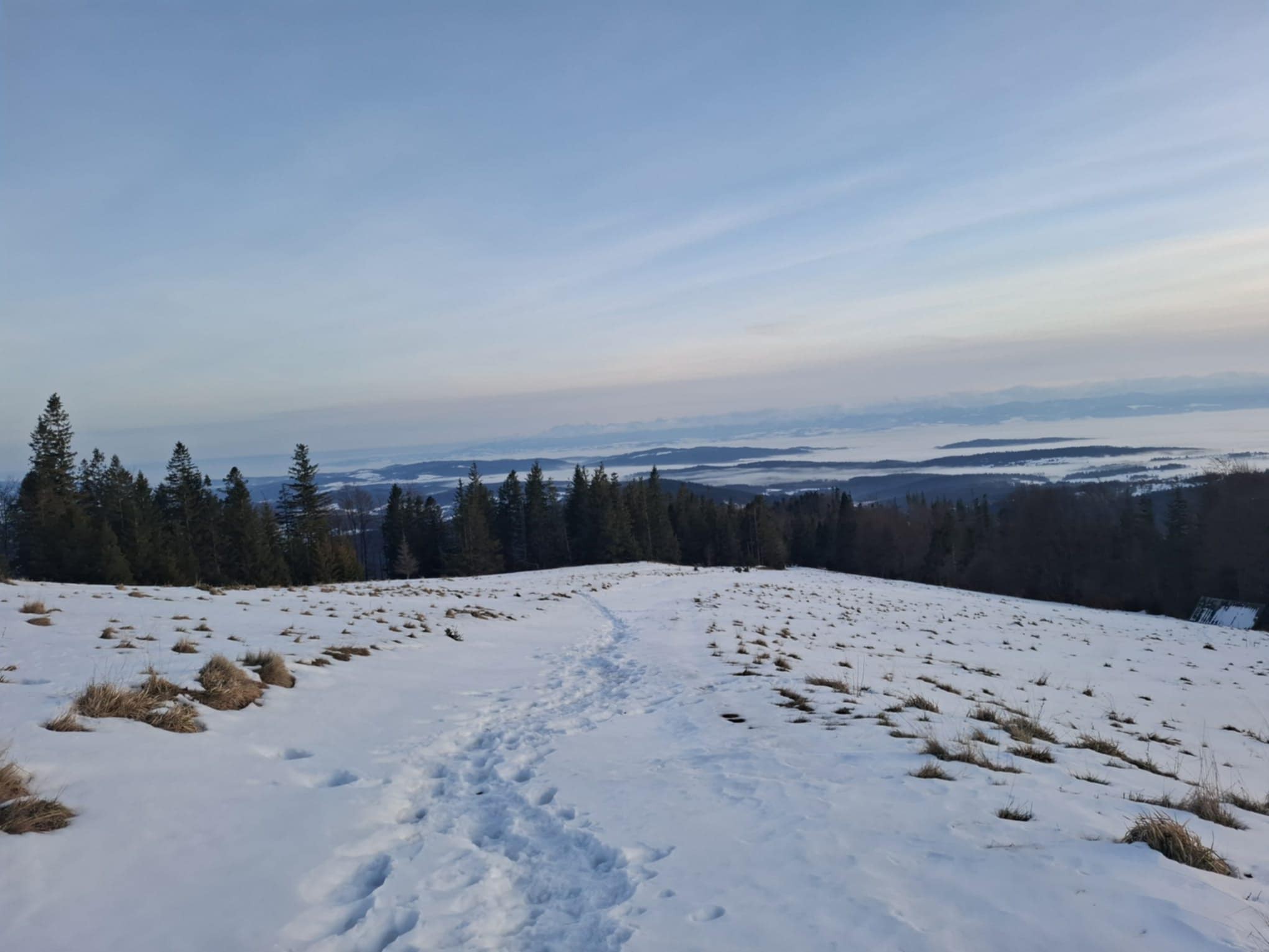 Tym razem pogoda dopisała i wędrując w śnieżnych krajobrazach można było podziwiać ośnieżone szczyty Tatr Wysokich w morzu mgieł u ich podnóży.